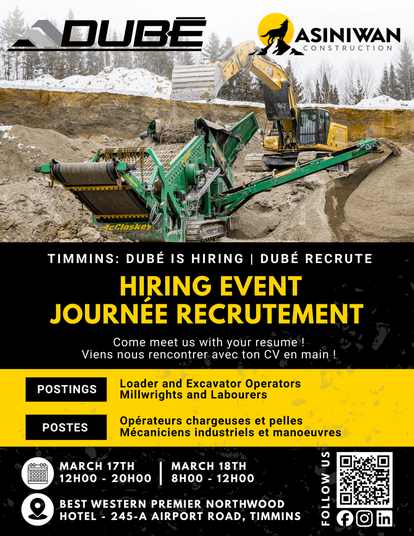 Dubé was founded by Dany Dubé, who is himself a native of Wahgoshig, Ontario. In order to contribute to the hiring of labor and community development, he started 2 other companies; one connected to the community of Wahgoshig - Asiniwan Construction as well as one connected to the community of Pikogan in Amos - Nikan Construction. NIKAN Construction and ASINIWAN Construction want to open the way for young people from the communities to obtain quality employment in the construction and mining industry.